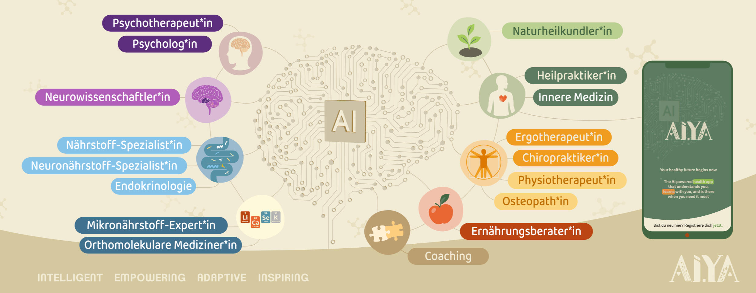 Ein lebendiges, interdisziplinäres Gesundheits-Ökosystem – digital verbunden durch die AIYA-Plattform....